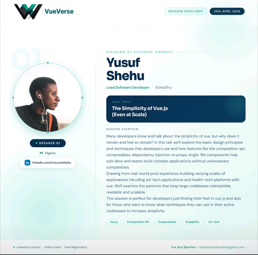 In this session, I walked through how Vue’s design philosophy helps developers write code that is readable, maintainable, and scalable, even as applications grow in size and complexity. While Vue is often described as beginner-friendly, the goal of the talk was to show that its simplicity is actually one of its strongest architectural advantages in production environments.